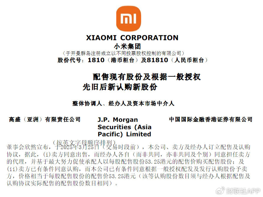 股权结构变化显示,配售完成后雷军持股比例将由24.10%微降至23.4%,其他股东合计持股从75.9%稀释至73.6%,新增投资者持有3.1%股权。